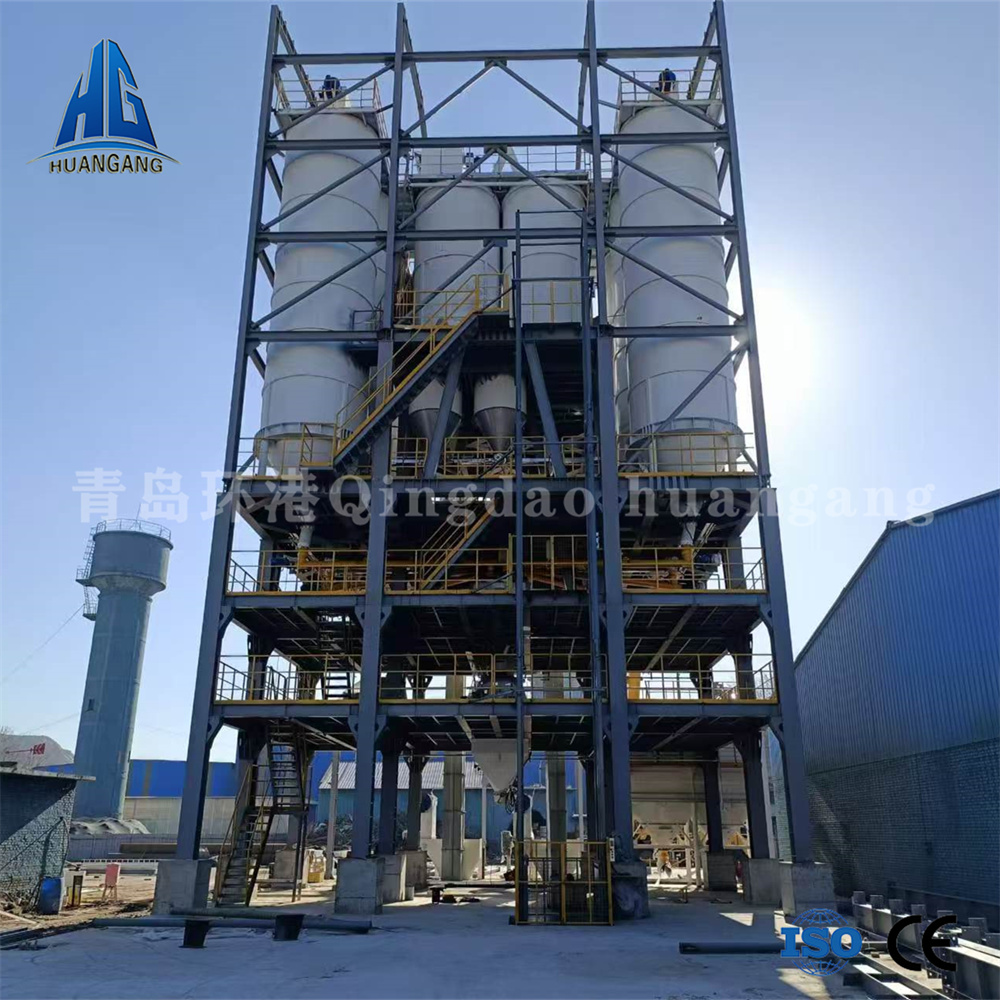 年產(chǎn)兩萬噸左右的砂漿生產(chǎn)線,一般情況下會用到3-6個原料罐,其中兩個大罐用于裝放散裝水泥和粉煤灰,其余小罐用于裝放輕鈣、重鈣、砂等。散裝水泥和粉煤灰進罐不需要提升設(shè)備,依靠泵車打入。散裝粉煤灰倉一般為圓筒支架結(jié)構(gòu),其上部有除塵設(shè)備,防止粉塵泄漏,下部裝有破拱裝置,防止粉料結(jié)塊,使粉料卸出順暢,并裝有料位傳感設(shè)備,可隨時掌握倉內(nèi)物料使用情況。
