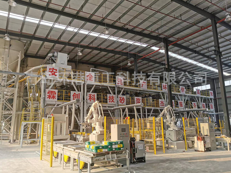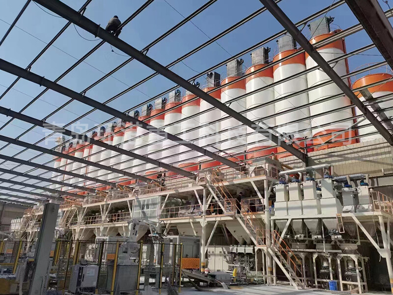 這是一套年產(chǎn)50萬(wàn)噸的全自動(dòng)環(huán)保膩?zhàn)臃鄢商自O(shè)備。通過(guò)調(diào)配原料的比例不同可生產(chǎn)內(nèi)墻膩?zhàn)?、外墻膩?zhàn)?、普通膩?zhàn)印㈢R面膩?zhàn)?、石膏膩?zhàn)拥榷喾N類(lèi)膩?zhàn)臃郛a(chǎn)品。每小時(shí)根據(jù)所選型號(hào)不同,可生產(chǎn)10~50噸產(chǎn)品,生產(chǎn)線主樓采用塔式結(jié)構(gòu),粉料倉(cāng)安裝在主樓頂部,外加劑系統(tǒng)采用獨(dú)立平臺(tái)計(jì)量泵送。骨料自上而下經(jīng)過(guò)計(jì)量層、混合機(jī)層、成品倉(cāng)、包裝機(jī)、碼垛線。根據(jù)膩?zhàn)臃鄣呐浞揭螅赏ㄟ^(guò)電腦計(jì)量精確配料后,經(jīng)過(guò)混合主機(jī)攪拌,即時(shí)生產(chǎn)出需要的膩?zhàn)臃郛a(chǎn)品。全過(guò)程采用智能自動(dòng)化操作模式,減少人力投入。